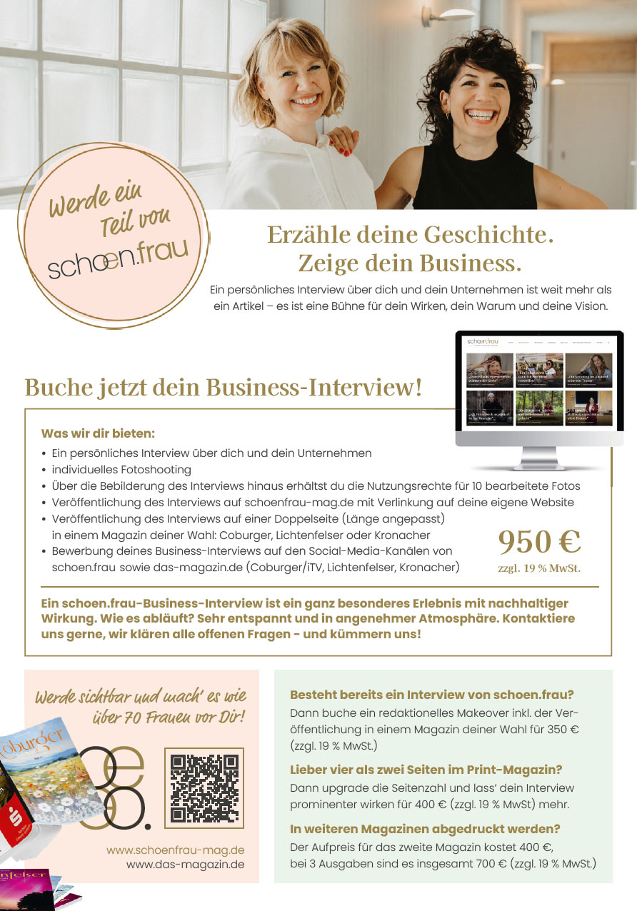 - Ein persönliches Interview über dich und dein Unternehmen auf schoenfrau-mag.de