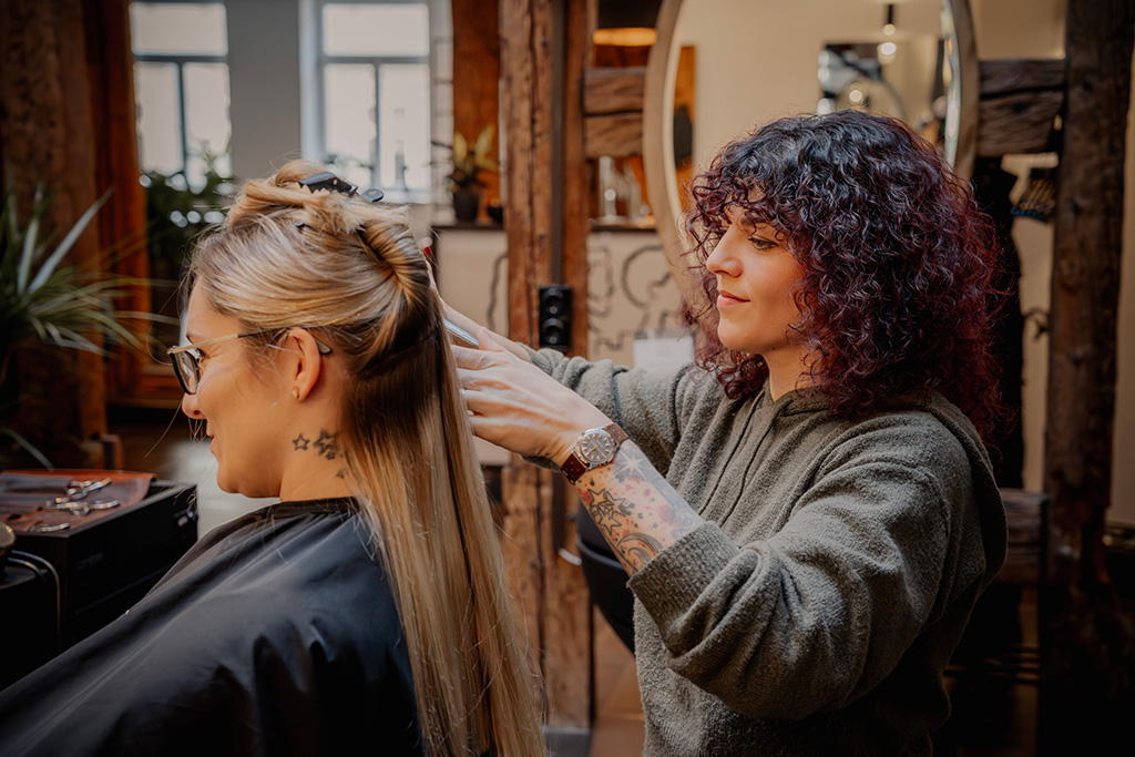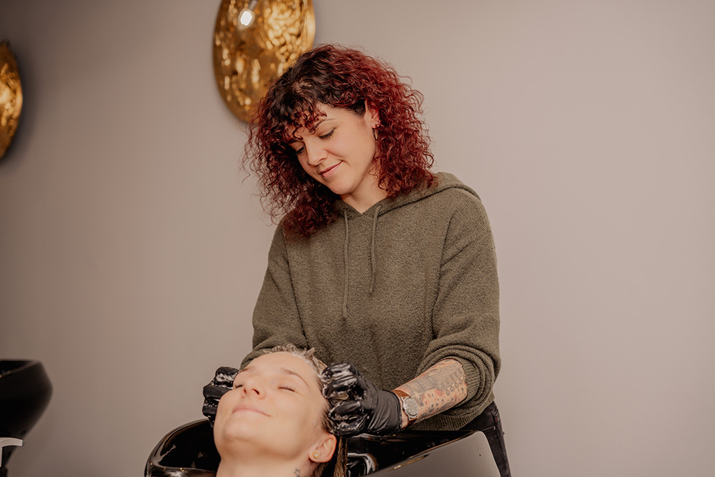 Liebe zum Tun: Conny ist mit viel Herz bei der Arbeit. Dabei verwöhnt sie ihre Kundinnen und Kunden gerne auch mit einer wohligen Kopfmassage.