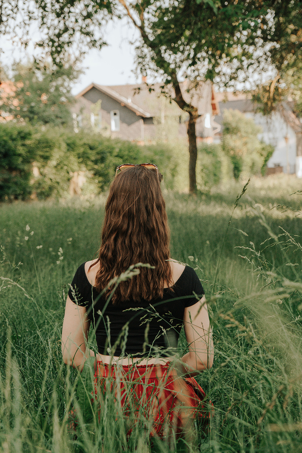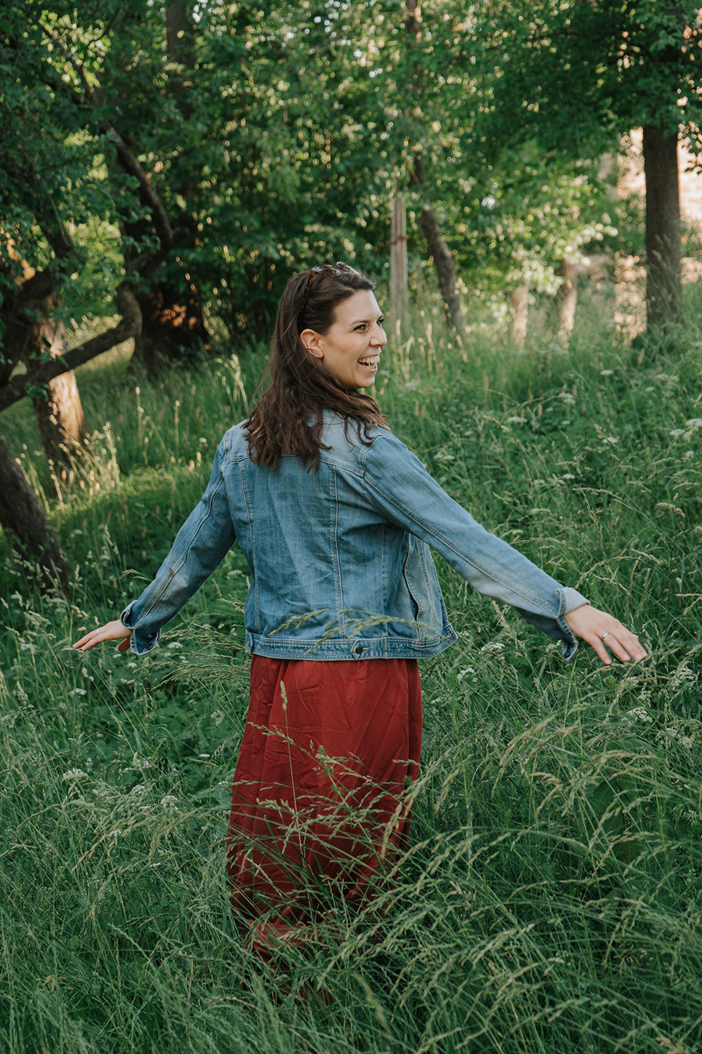 Nach meinem Schulabschluss wusste ich zunächst nicht, was ich machen möchte und bin zum Glück durch ein soziales Jahr in einer Kinderkrippe gelandet. Hier habe ich mich sofort unglaublich wohl, gesehen und gebraucht gefühlt. Danach begann ich meine Ausbildung zur Erzieherin und habe viele Jahre in einer sehr offenen und kreativen Kita gearbeitet. Mit 19 Jahren habe ich bereits geheiratet und bin anschließend nach der Hochzeitsreise mit meinem Mann nochmal alleine für ein paar Monate nach Neuseeland gereist. Ich habe schon immer dieses Gefühl von Freiheit und Eigenständigkeit für mich gebraucht. Zurück von dieser Erfahrung habe ich hier daheim bald mein erstes Kind bekommen dürfen. Und während der Corona-Krise mein zweites (lächelt, schaut dann aber nachdenklicher). Dann sollte sich etwas ändern in meinem Leben. Ich erlitt eine langwierige Wochenbettdepression und zusehends drängte sich die Frage in mir auf: Wer bin ich eigentlich?